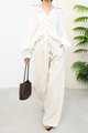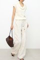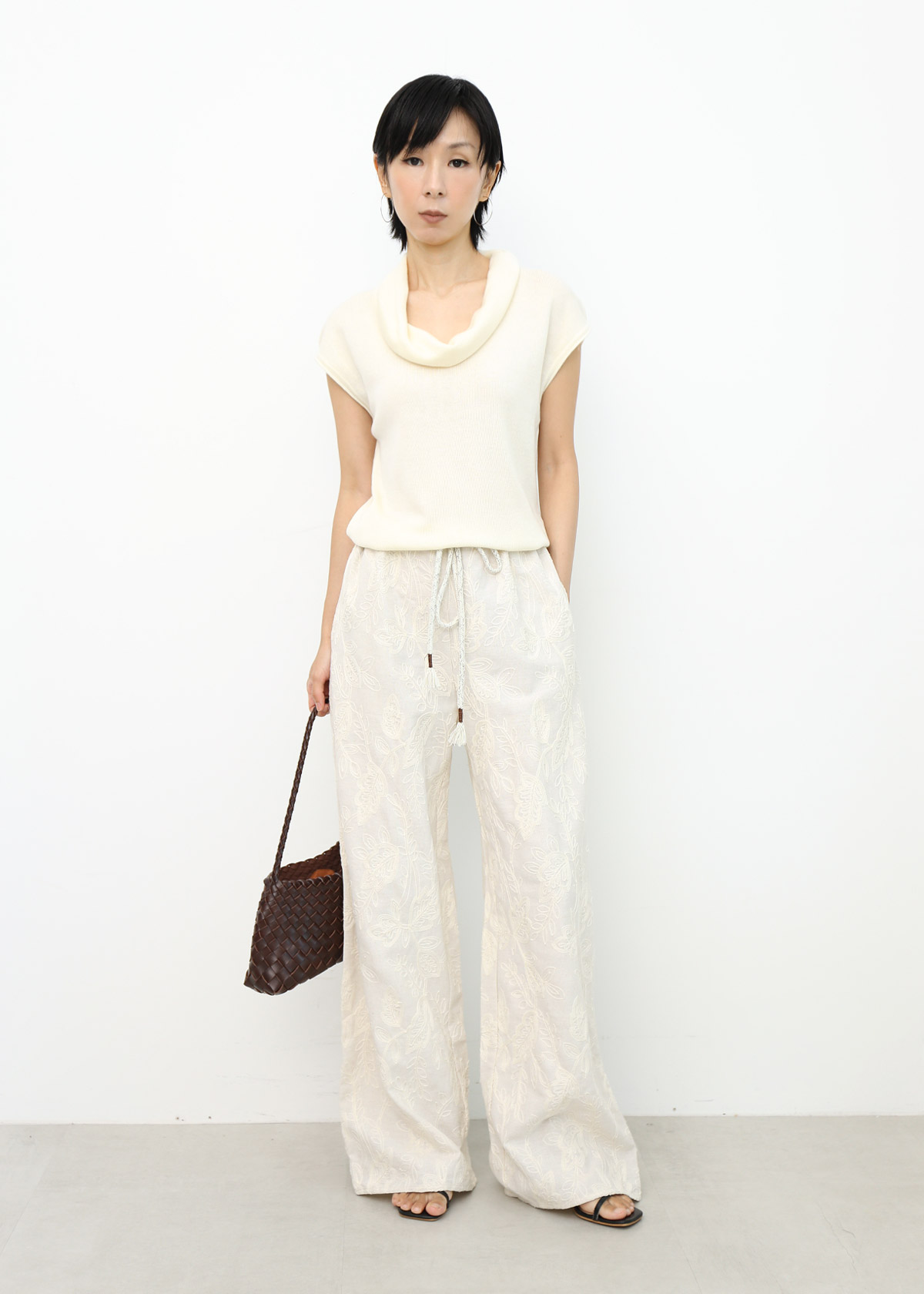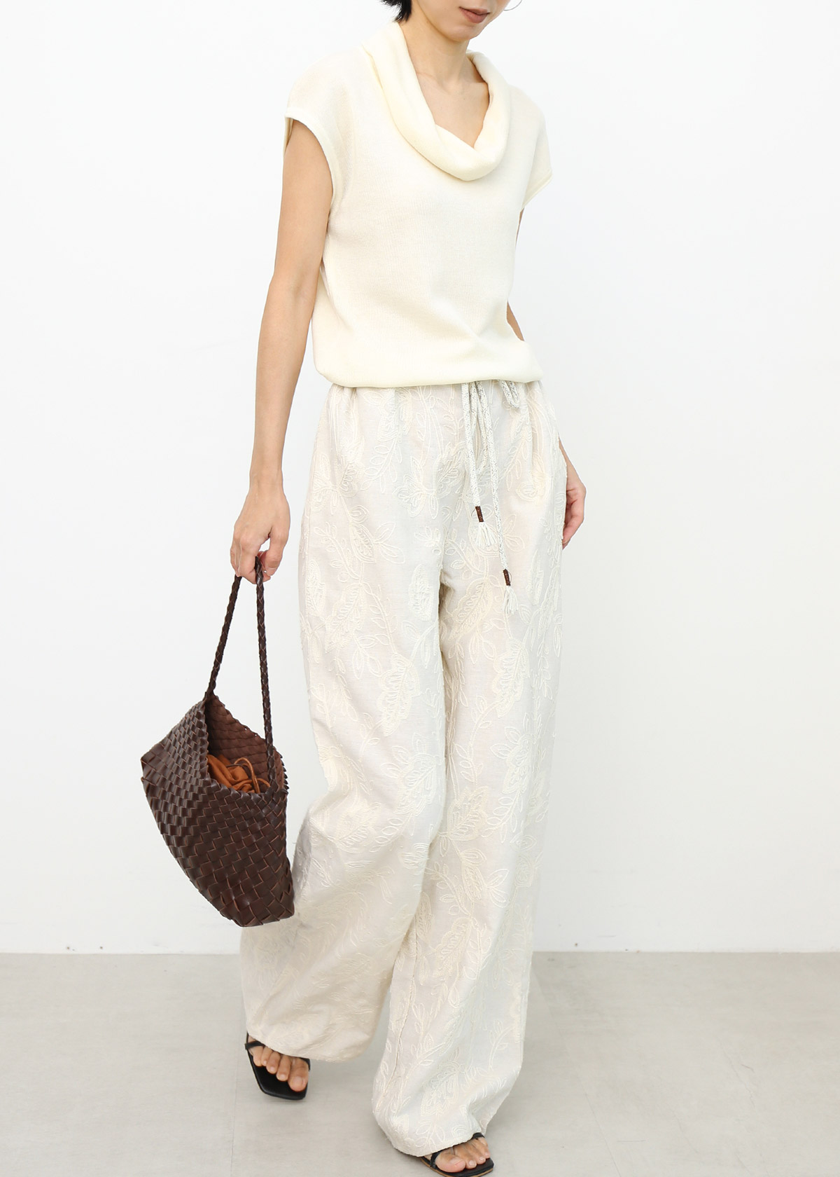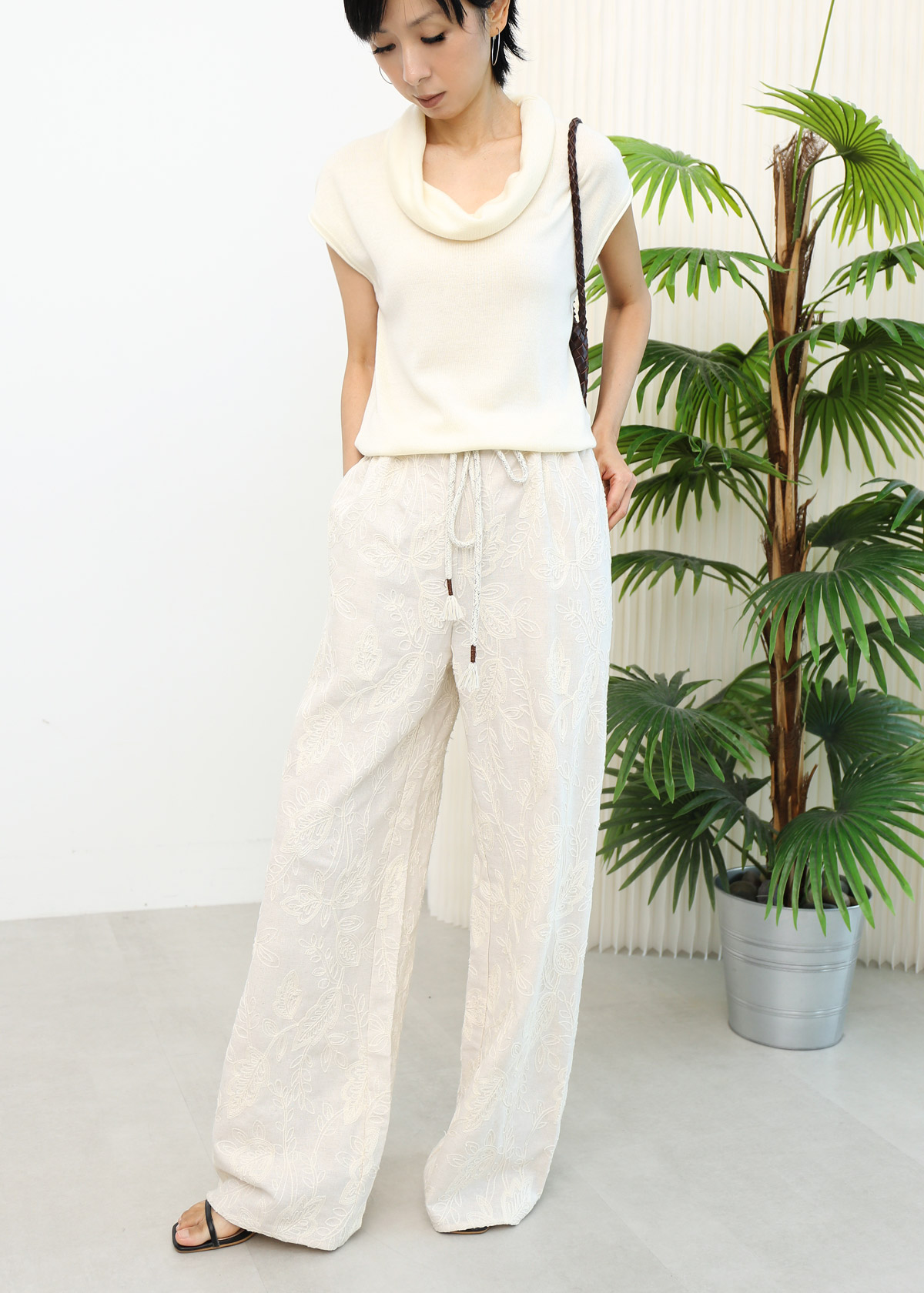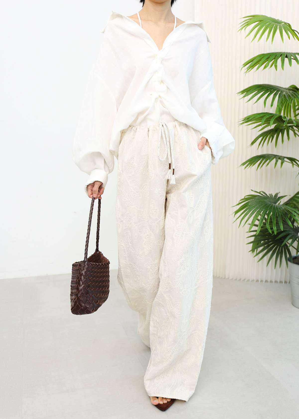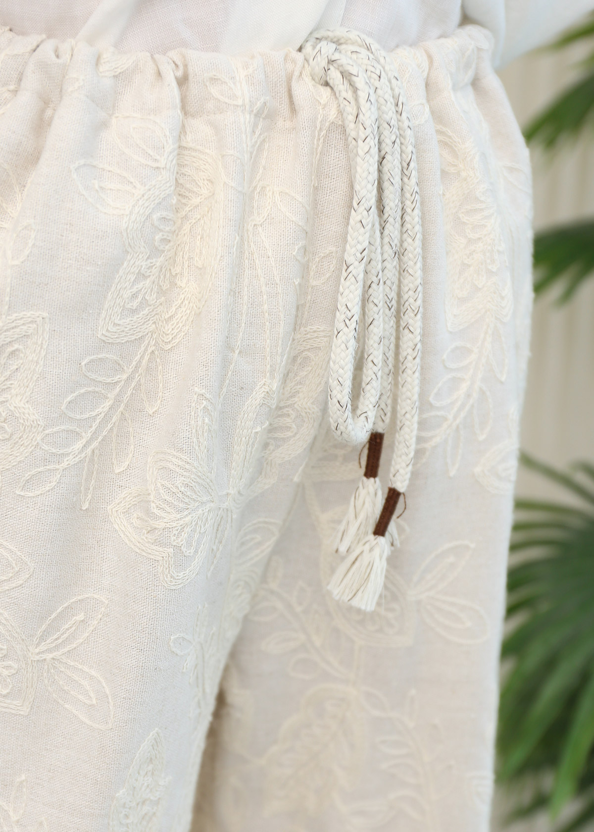 - Embroiderd linen blend pants with elastic back and drawstring at the front