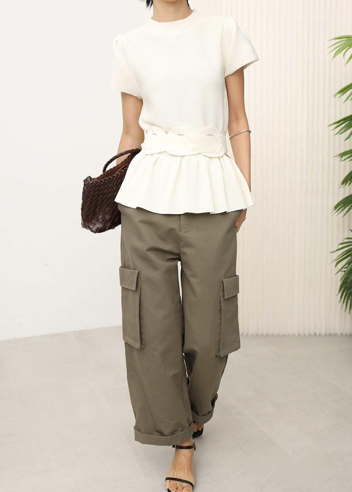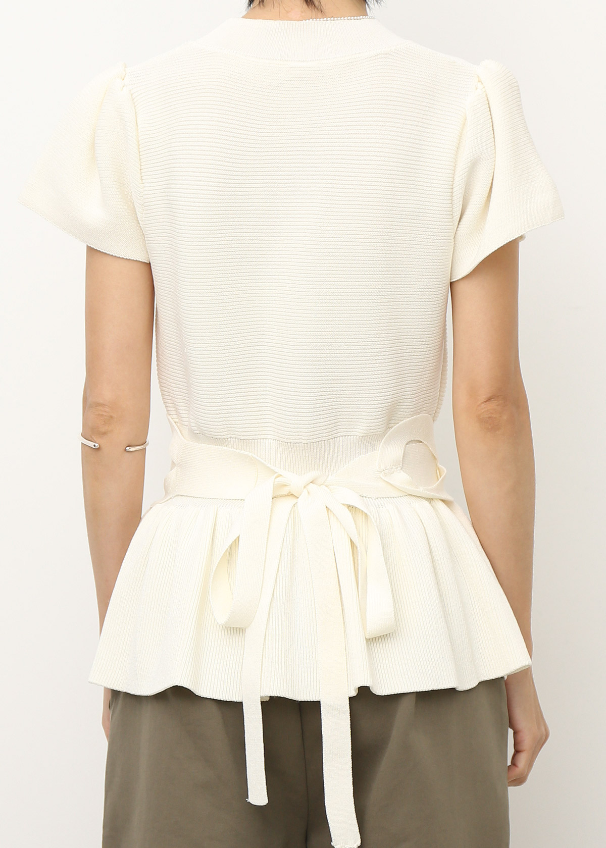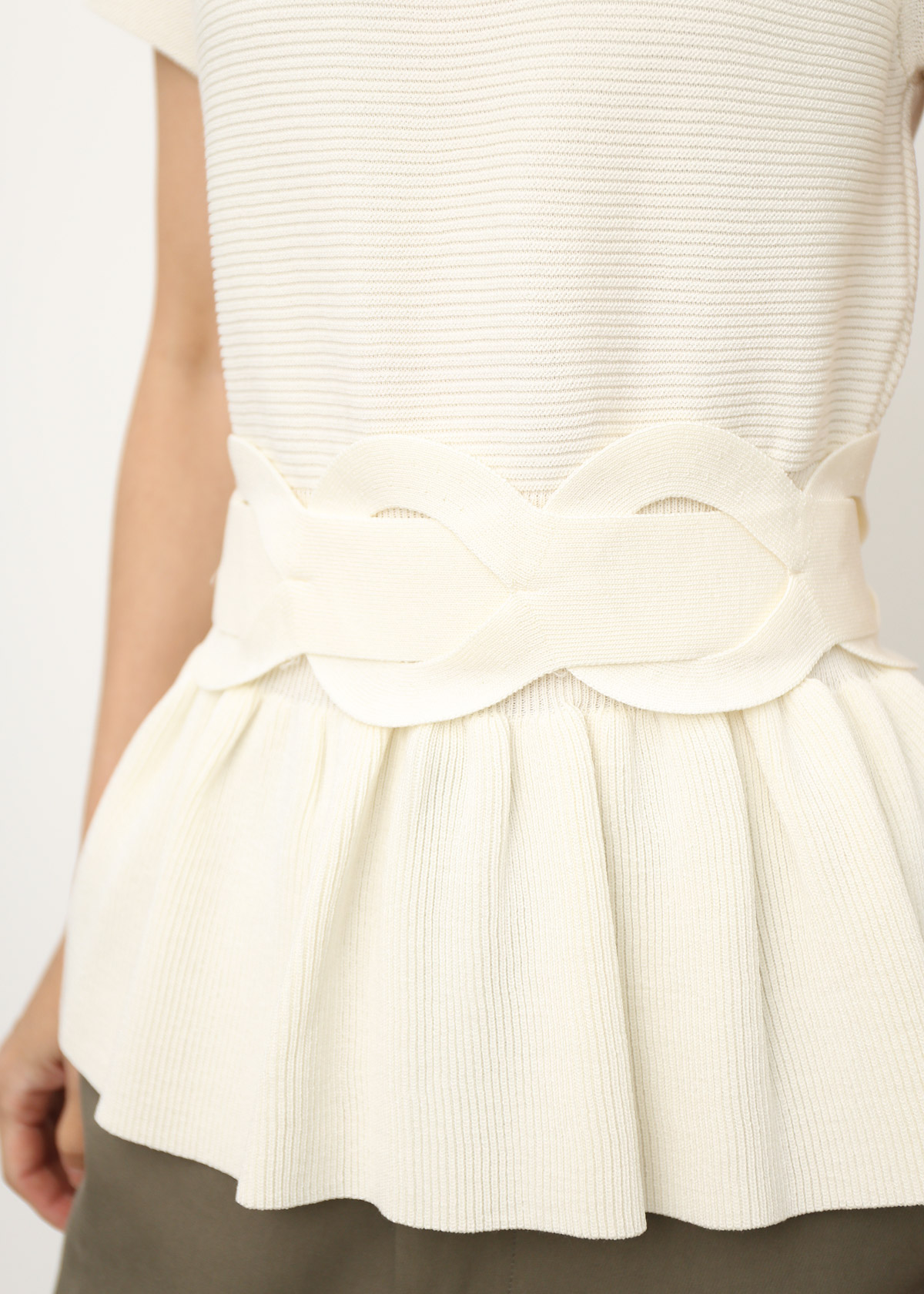 Peplum Knit Top with Waist Tie Belt [White]