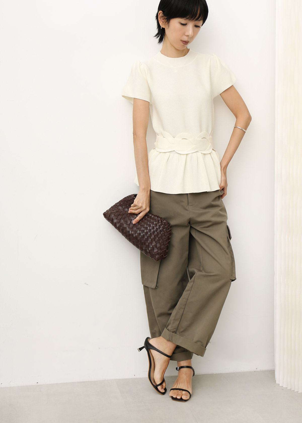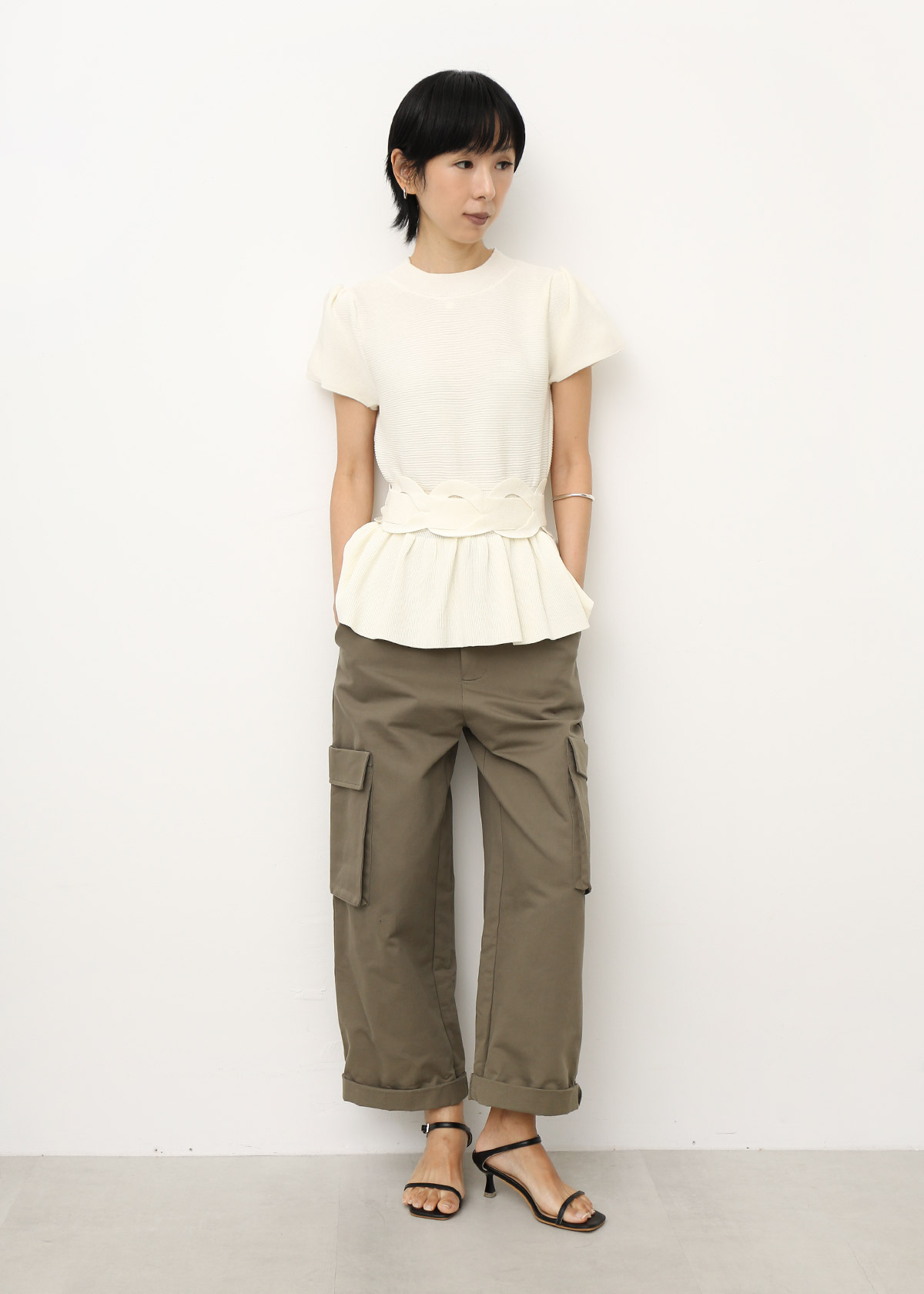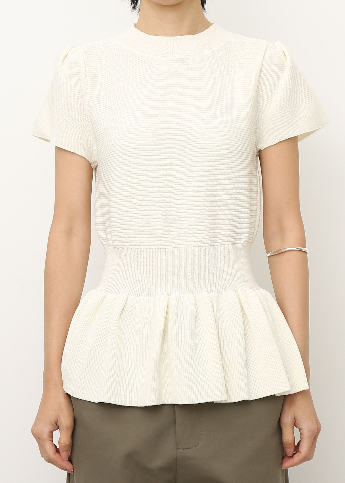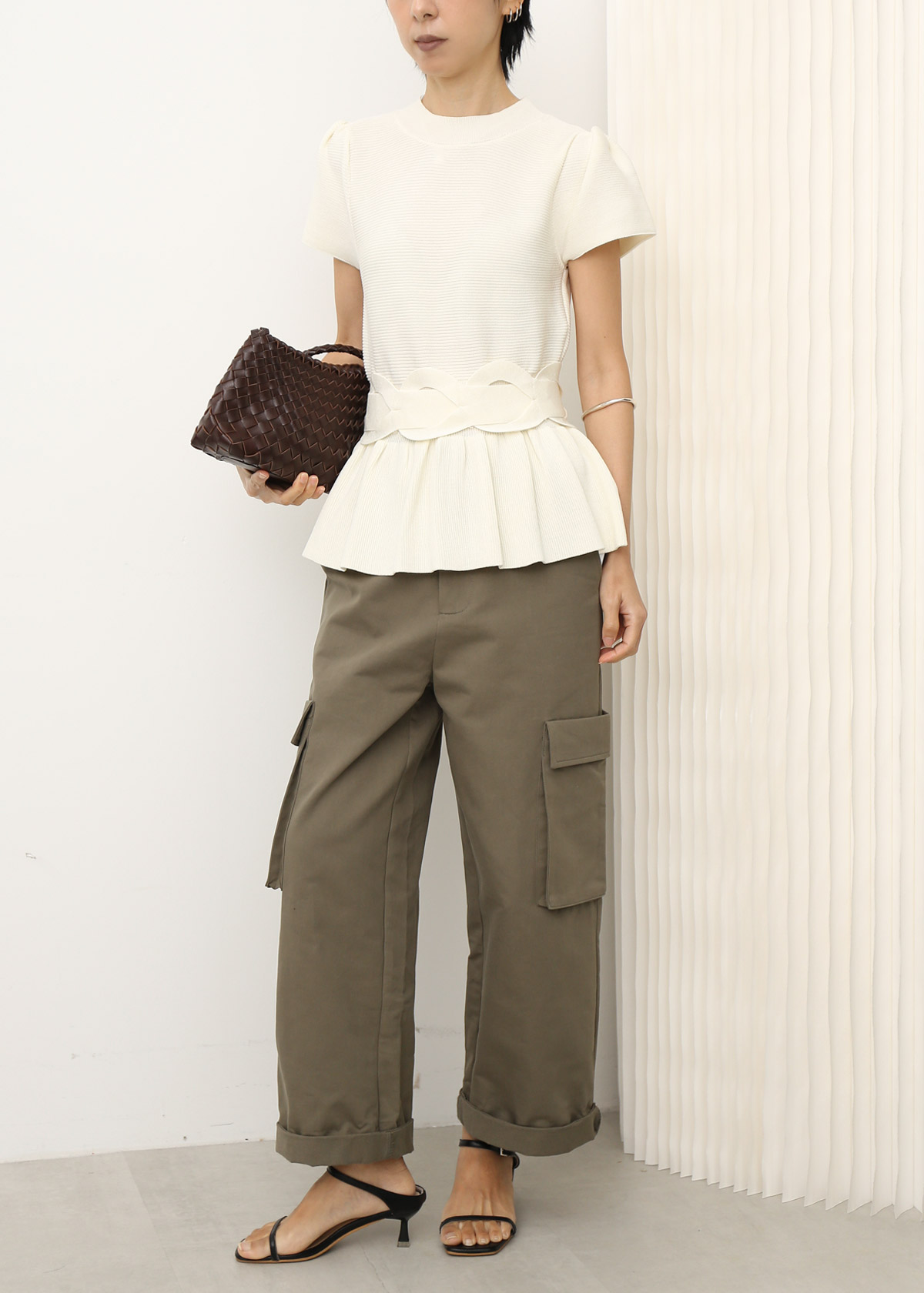 Peplum Knit Top with Waist Tie Belt [White]